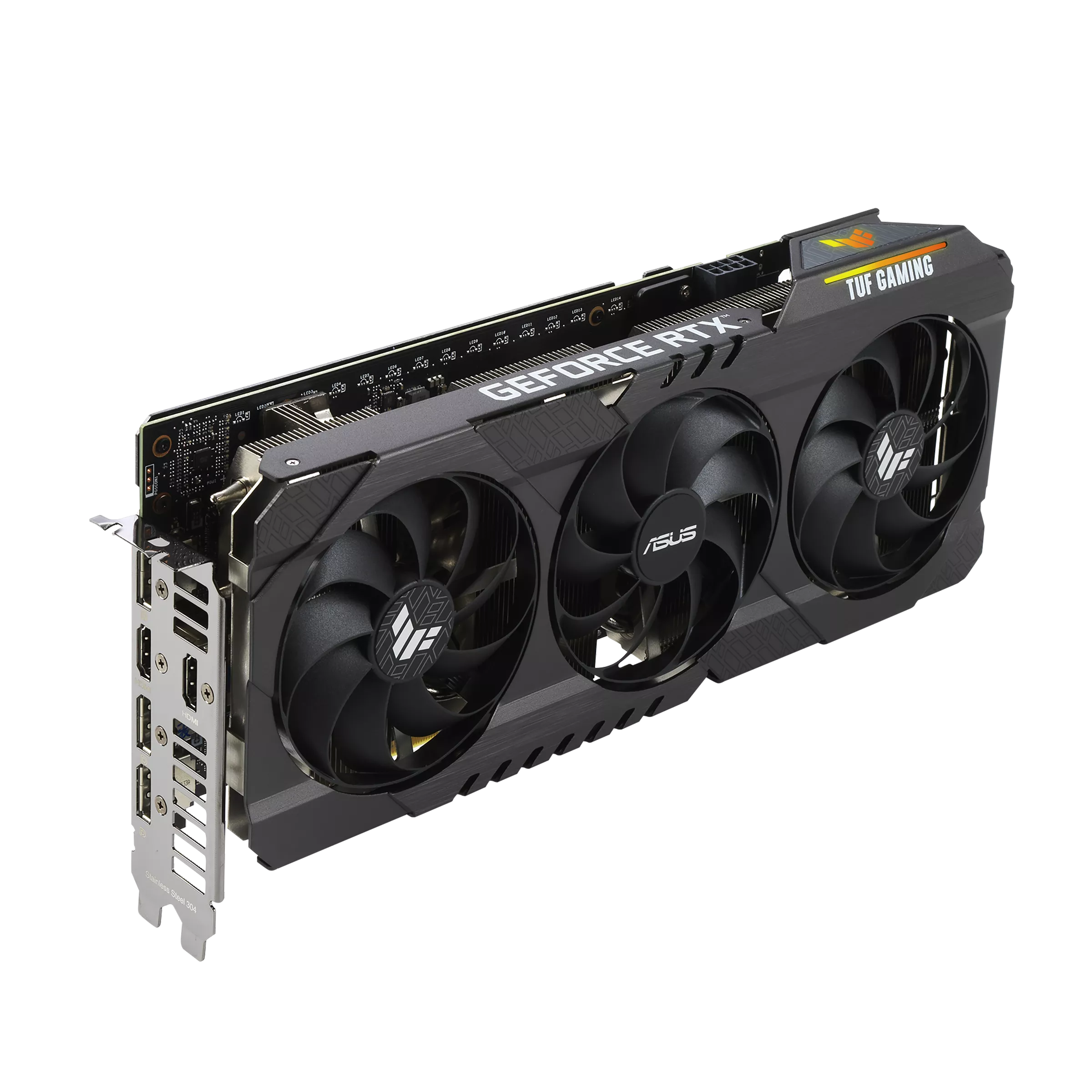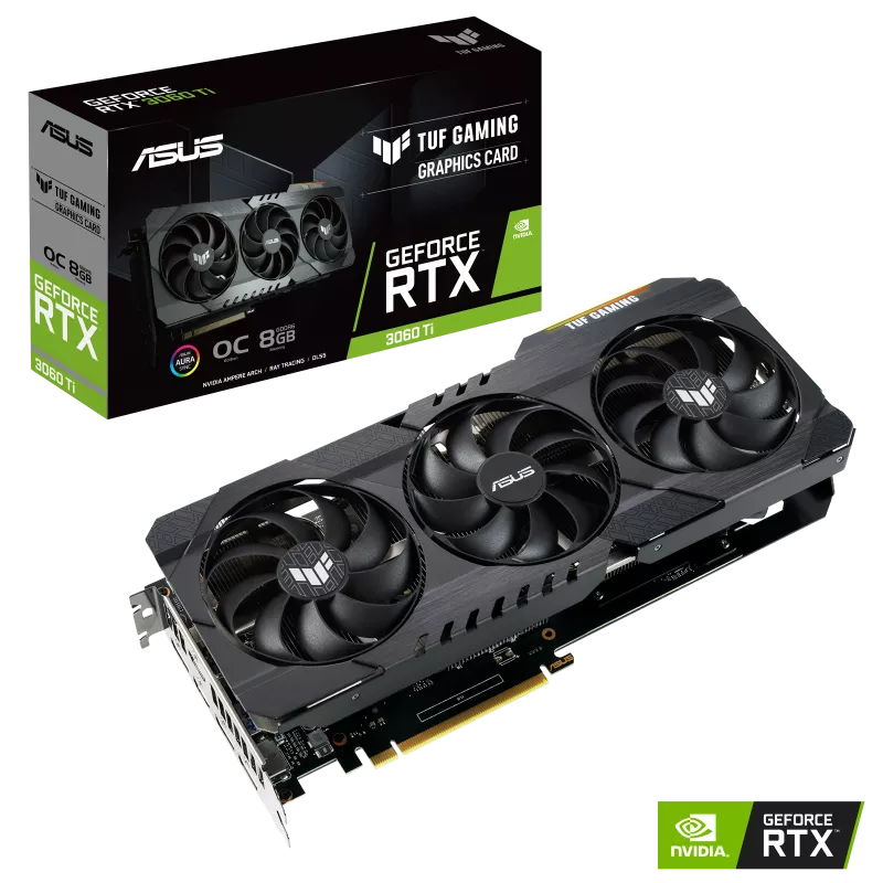 ASUS TUF Gaming RTX 3060 Ti memiliki memori 8GB GDDR6, bus PCI Express 4.0, dan mendukung resolusi digital hingga 7680 x 4320. Kartu ini dirancang dengan tiga kipas Axial-tech untuk sirkulasi yang efektif, komponen berkualitas tinggi untuk daya tahan, serta mendukung fitur seperti AURA Sync RGB untuk pencahayaan terpersonalisasi dan ASUS GPU Tweak II untuk performa dan kontrol.
