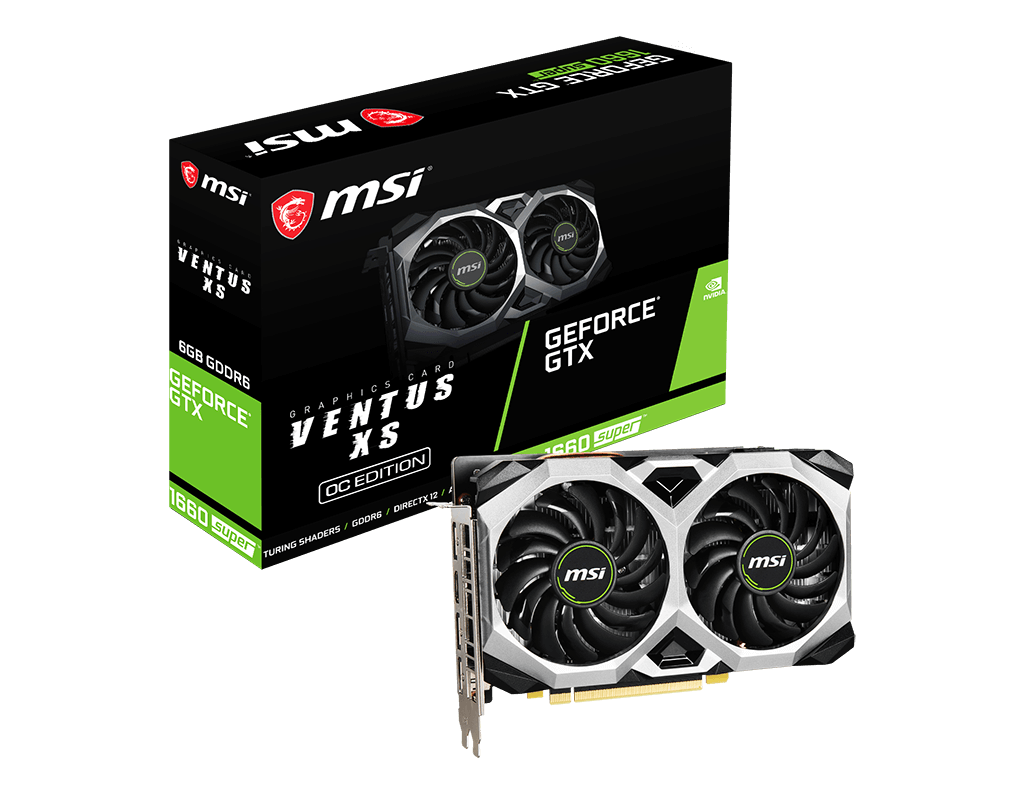 MSI GTX 1660 Super Ventus XS adalah kartu grafis berbasis arsitektur NVIDIA Turing dengan 6GB VRAM GDDR6, 1408 CUDA core, dan clock speed Boost 1815 MHz. Kartu ini memiliki antarmuka memori 192-bit, bus PCIe 3.0 x16, dan TDP 125W, serta dilengkapi dengan port DVI, HDMI 2.0, dan DisplayPort 1.4a.