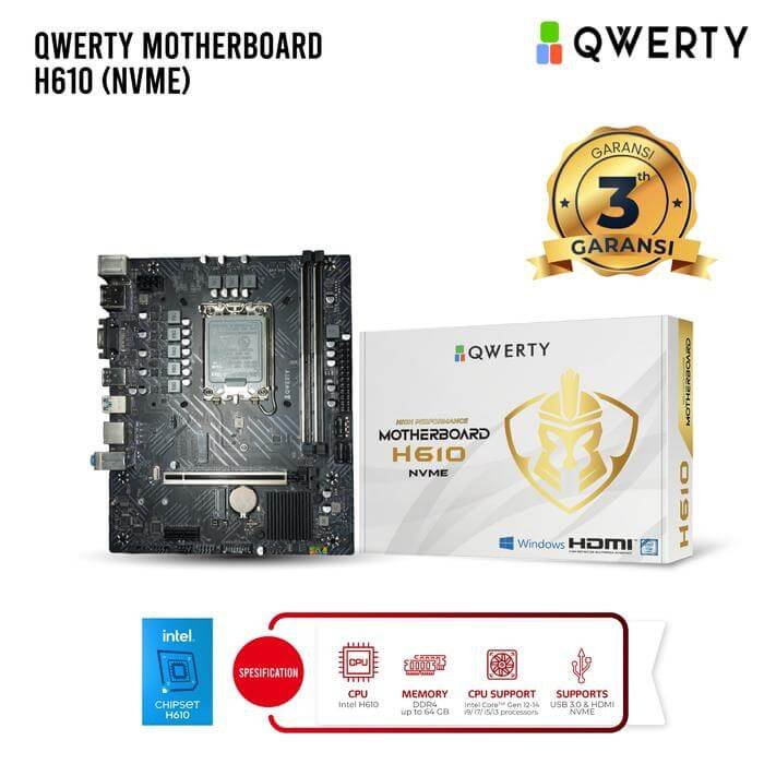 Motherboard Qwerty H610 NVMe mendukung prosesor Intel Core generasi 12 dan 14 (i9/i7/i5/i3) dengan chipset Intel H610Motherboard ini menggunakan memori DDR4 dengan kapasitas maksimal 64GB. Selain itu, ia mendukung NVMe SSD untuk penyimpanan dan memiliki port USB 3.0 serta HDMI.